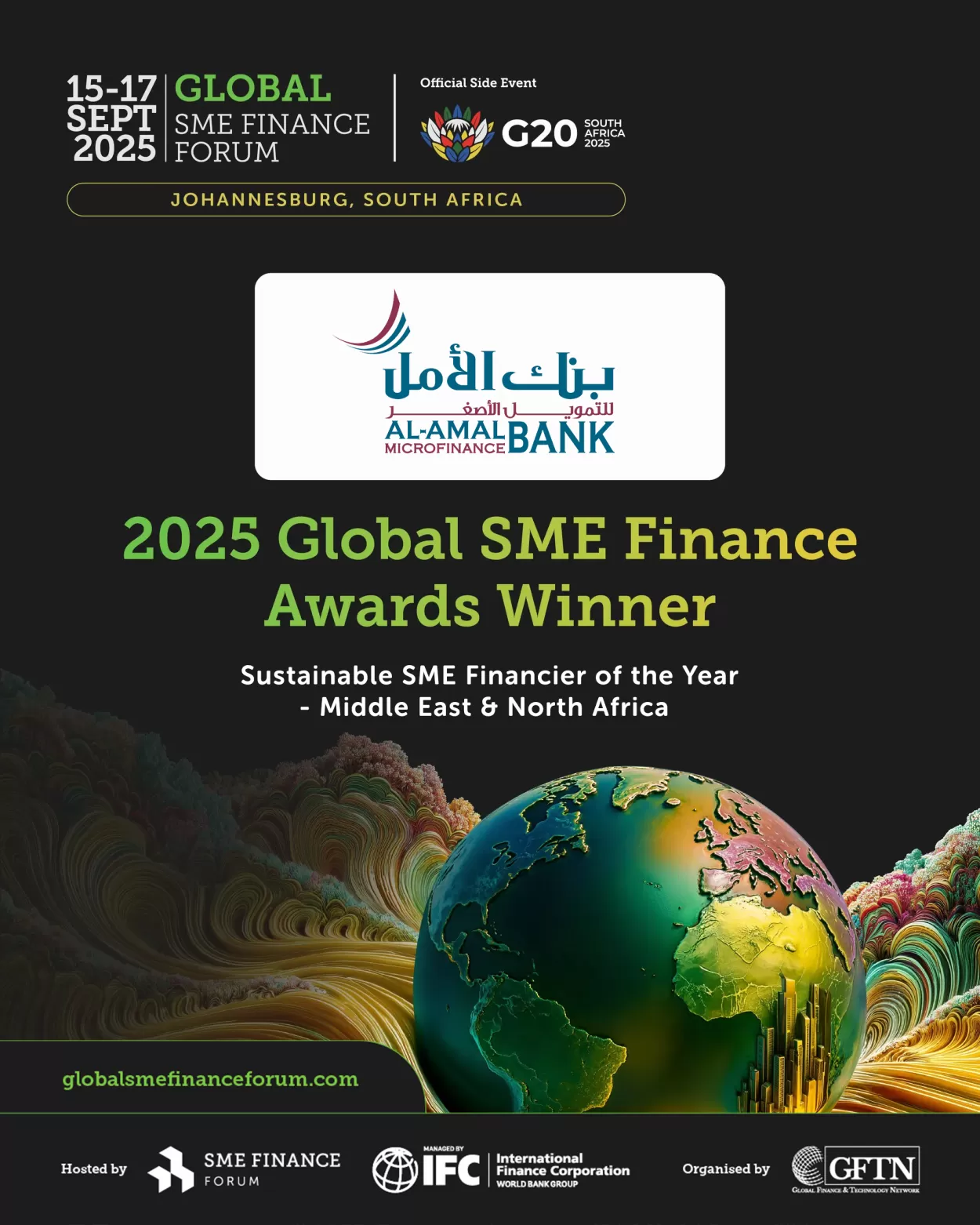 وقد تم الإعلان عن الجائزة خلال فعاليات المنتدى العالمي للتمويل للمشروعات الصغيرة والمتوسطة (15 – 17 سبتمبر 2025م)، والذي عُقد كفعالية رسمية على هامش قمة مجموعة العشرين بجنوب أفريقيا، ليؤكد هذا الإنجاز مكانة البنك الريادية في مجال التمويل المستدام والشمول المالي ويعكس التزام فريق البنك وإصراره على تمكين رواد الأعمال وأصحاب المشروعات الصغيرة والمتوسطة، رغم التحديات التي تواجه بلدنا والمنطقة.